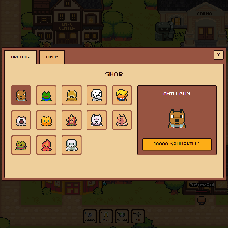 Play to earn in-game currency, or use $PUMPVILLE to unlock special avatars, pets, items and more. Win arena battles, complete challenges, and gain experience as you explore more of the map.